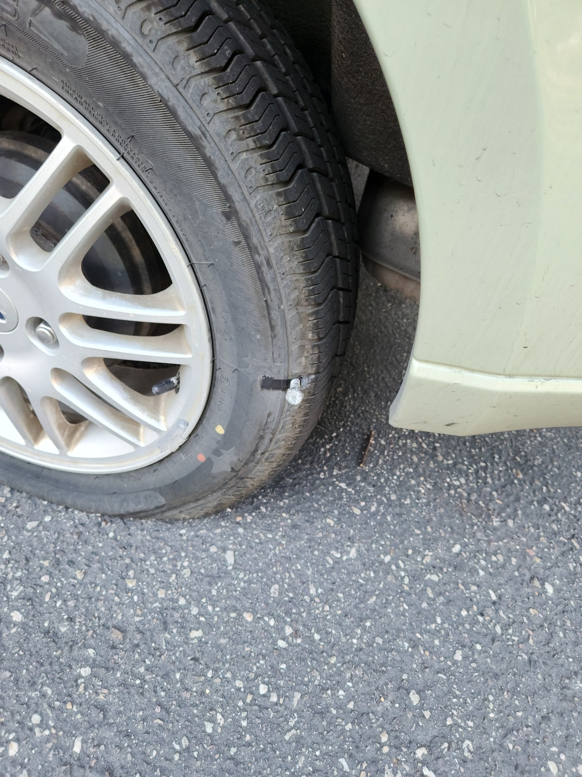 As we were driving down the canyon enjoying the post-hike exhaustion and foliage, a low tire pressure indicator light flicked on. My daughter had just left the car shop earlier this week having her tire pressure values checked because the same indicator had been going on and off, so we thought nothing of it. We continued on our way, stopping at Grandma’s house for a quick hi (and trying to get home after dinner was made – tricky, I know!) but as we were about to leave Grandpa pipes up with “Looks like you aren’t going anywhere!” Lo and behold, the tire was flat. With a giant Franken-sized bolt sticking out.